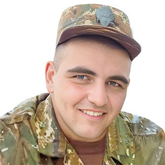 Զինվորական գործը։ Դեռ 4 տարեկանում, ձմեռ պապիկից խնդրել էր զինվորական հագուստ և ուրախությամբ ասում էր․ «Ես իսկական զինվոր եմ»։ 9-րդ դասարանից ընդգրկվել էր երկրապահների կամավոր միությունում։